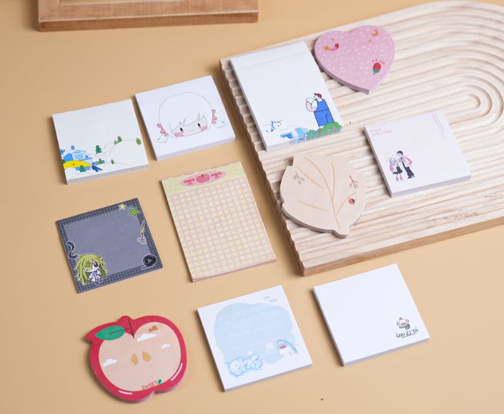 We also provide sticky note books combining multiple shapes in one volume; cute sticky notes can be customized into various shapes; and sticky note tabs are rectangular pieces of thin paper with adhesive on one side. We support printed sticky notes, allowing you to print your logo and designs on the notes with full-color branding on all four sides.