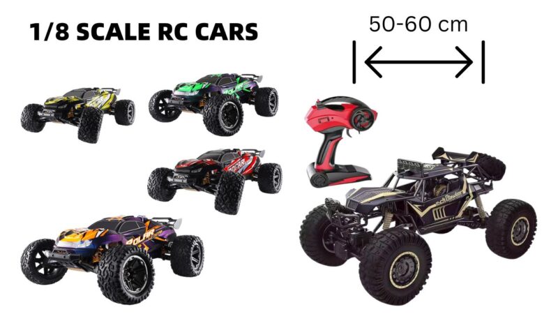A 1/8 scale RC car, with a length of approximately 50–60 cm, is a large-scale model. Its body size is similar to a carry-on suitcase, and it features powerful performance, making it ideal for professional off-road tracks and competitive racing.